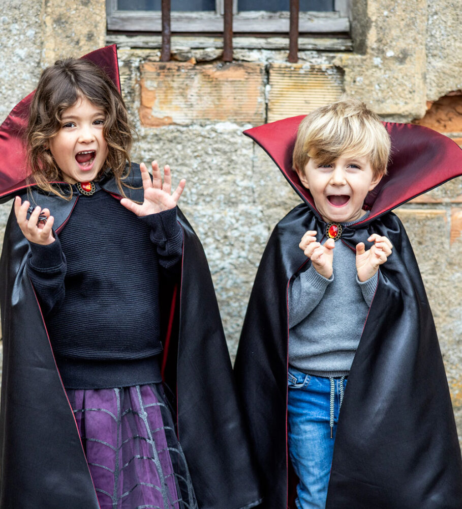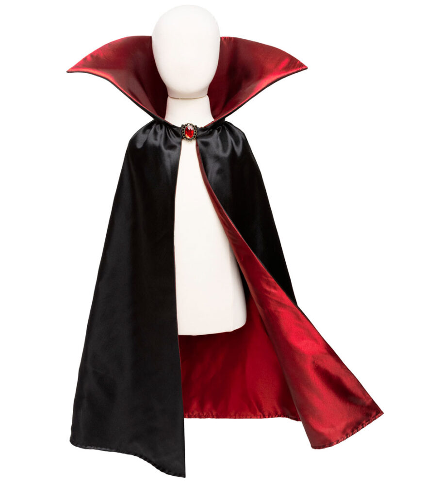 Confectionnée dans un tissu noir luxueux et doublée d’un somptueux satin rouge, cette cape dégage une allure noble et imposante, idéale pour incarné un vampire charismatique ou un comte mystérieux.